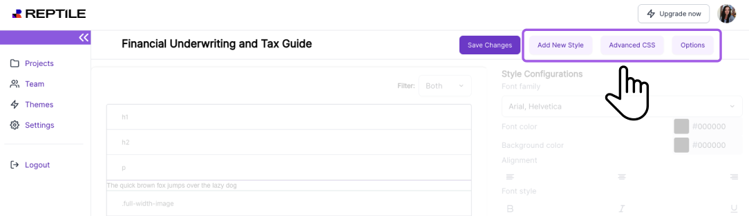 2. **Edit CSS:** Click on the "Advanced CSS" button to access and edit the CSS. This option allows users with CSS knowledge to further customize text and images based on the styles defined in the Theme Dashboard. You can also apply custom CSS to new styles added to the theme.